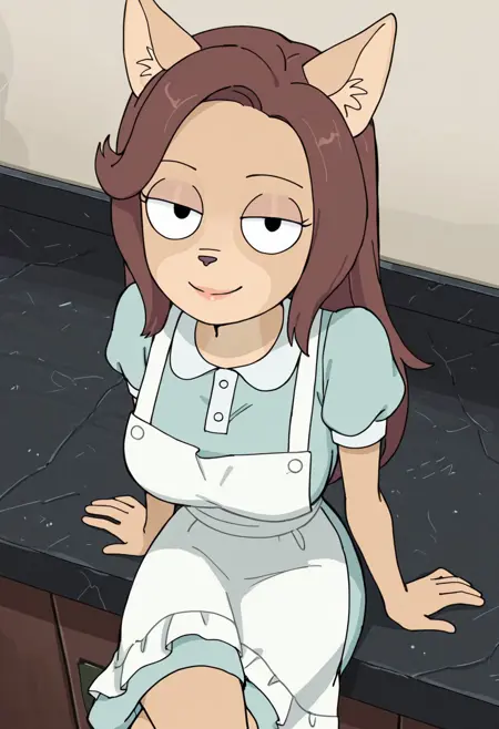 Trigger Words: 1girl, Solo, furry, Arthricia_RaM, feline, cat nose, pointed ears, cat ears, light brown fur, darker brown hair, hair flowing, light blue dress, white apron, long black boots