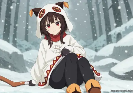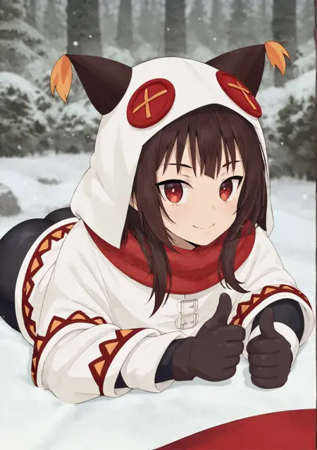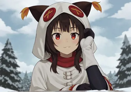 megumin, kono_subarashii_sekai_ni_shukufuku_wo!, 1girl, solo, winter clothes, cat ears, white hoodie, white hood, short hair, short hair with long side locks, brown hair, red eyes, red scarf, white cape, gloves, black bodysuit,