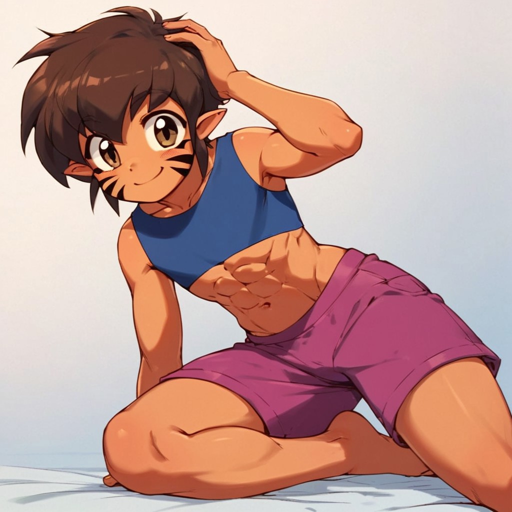 tghmn, pointy ears, facial mark, brown hair,short hair, brown eyes,