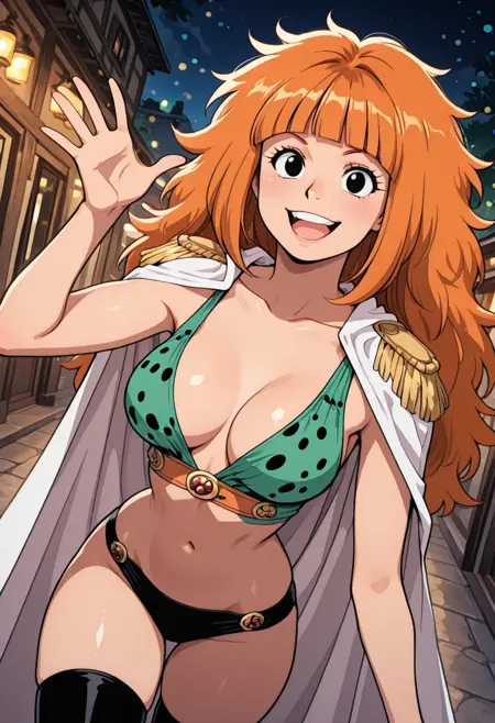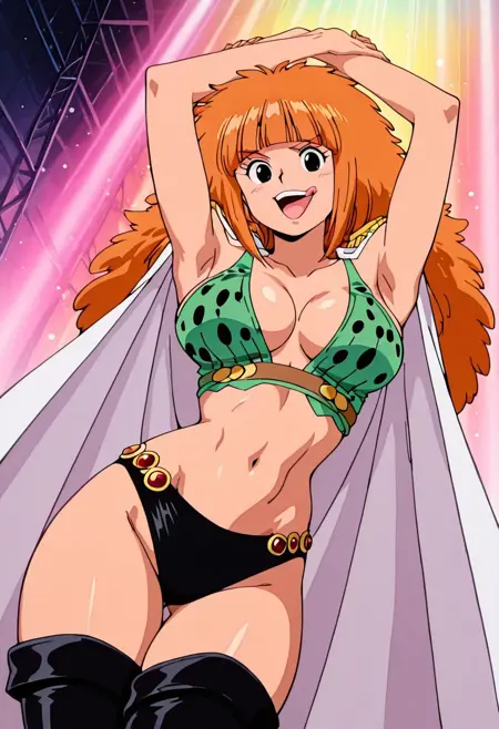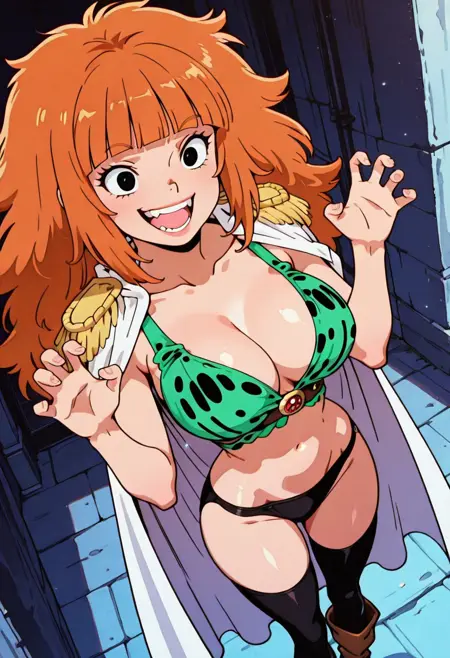 DaisyOP, 1girl, solo, 날씬한 소녀, 오렌지색 머리, 긴 머리, 풍성한 머리, 검은 눈, 웃는 얼굴, 망토, 가슴 노출, 큰 가슴, 어깨장식, 긴 검정 스타킹, 검정 팬티, 배꼽, 허리, 성기, 부츠, 목뼈, 드문드문한 녹색 상의, 벌어진 입, 옷 장식