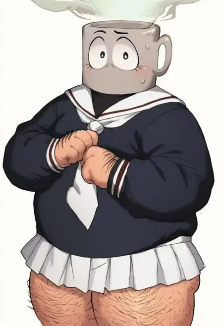 Joe cuppa, steam coming from head, Mouthless, cartoon eyes, round eyes, fat body, chubby, white T-shirt, blue trousers, red necktie, object head, mug head