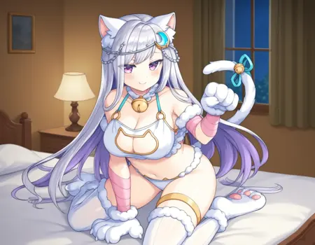 navel, silver diadem, hair ornament, crescent hair ornament, cat girl, cat lingerie, cat tail, tail ribbon, tail bell, cat ears, cat cutout, cleavage cutout, neck bell, pink ribbon, blue ribbon, fur-trimmed thighhighs, jewelry, aqua gem, cleavage, bare shoulders, fur-trimmed gloves, animal hands, fur-trimmed legwear, cat paws, fur trim, white detached collar, golden thigh strap