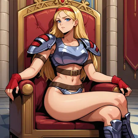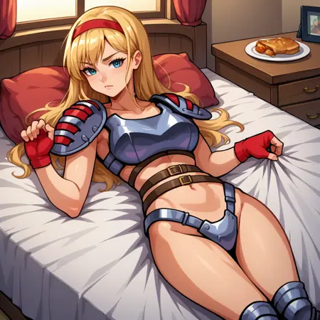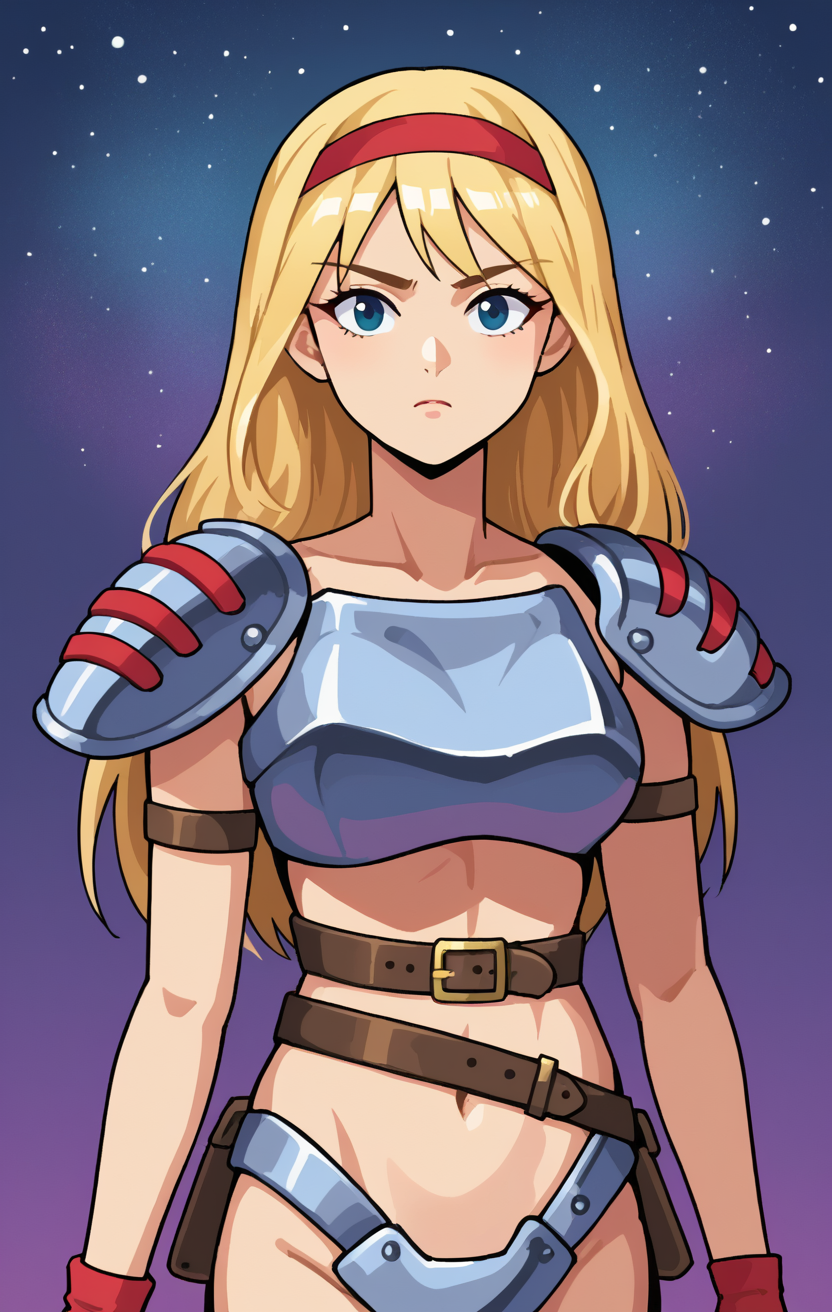 フィンガーレスグローブ、ヘアバンド、胸当て、ビキニアーマー、へそ、ベルト、膝パッド、パウルドロン