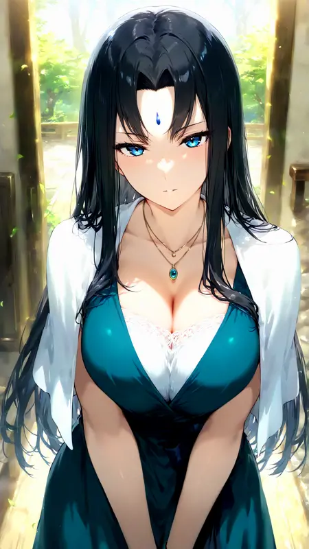 Appearance:blue eyes,black hair, long hair, large breasts, forehead jewel,tsurime,mature female,