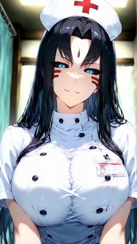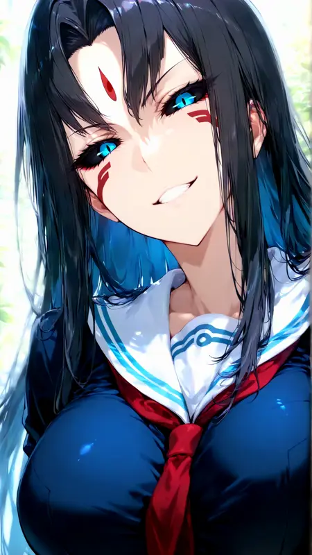 Appearance:blue eyes,colored sclera, black sclera,black hair, long hair, large breasts,facial mark,forehead mark,tsurime,