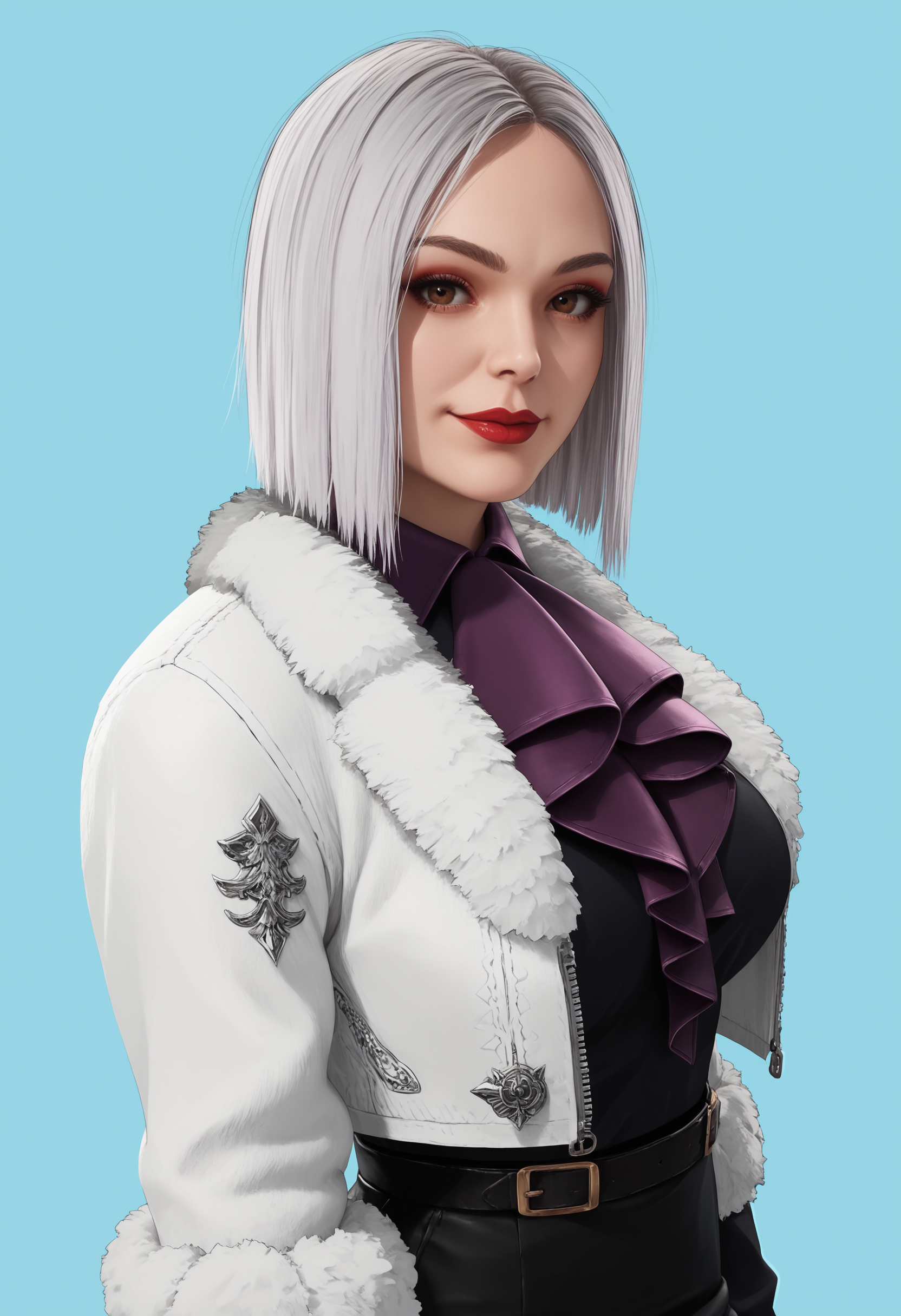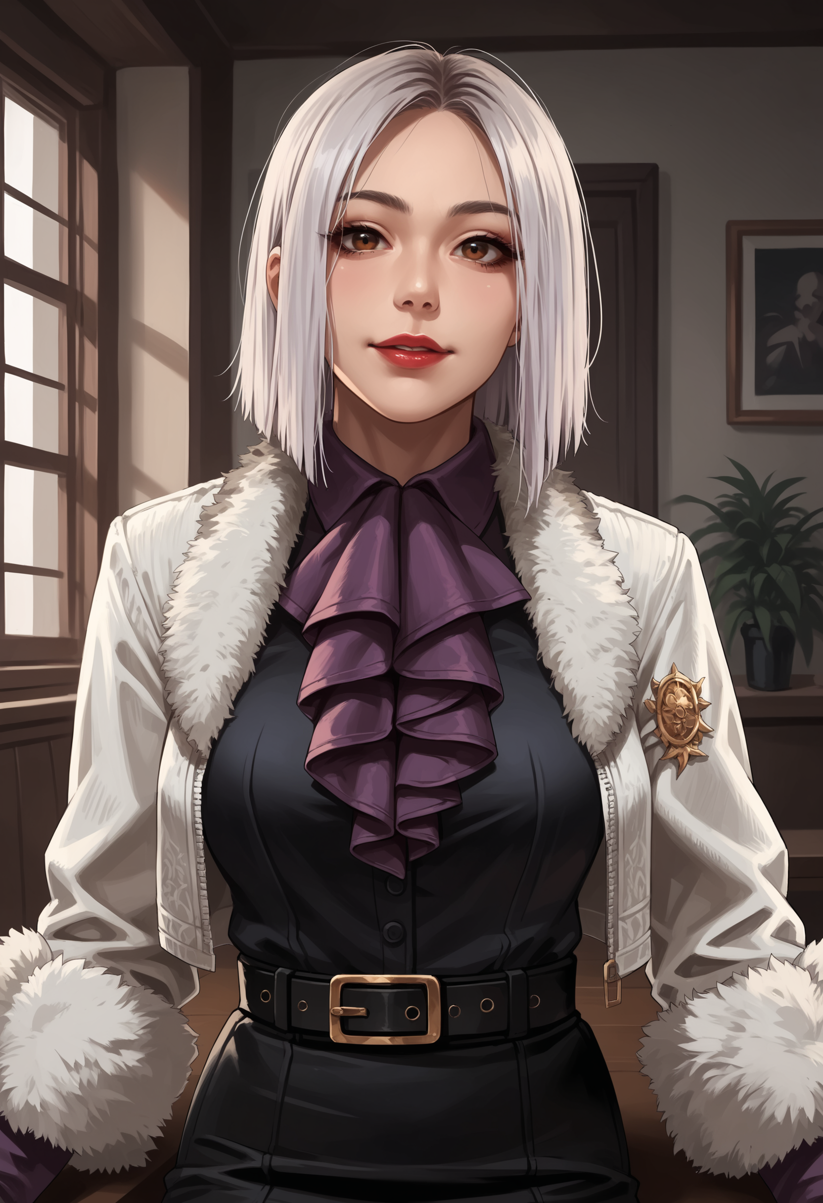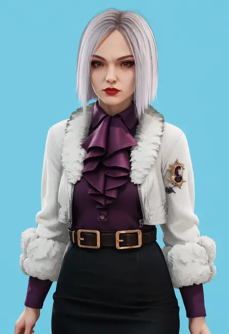 1girl, 短发, 白发, 嘴唇, 口红, 妆容, 领巾, 夹克, 毛皮镶边, 裙子, 黑色裙子, 黑色鞋履, 腰带