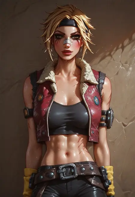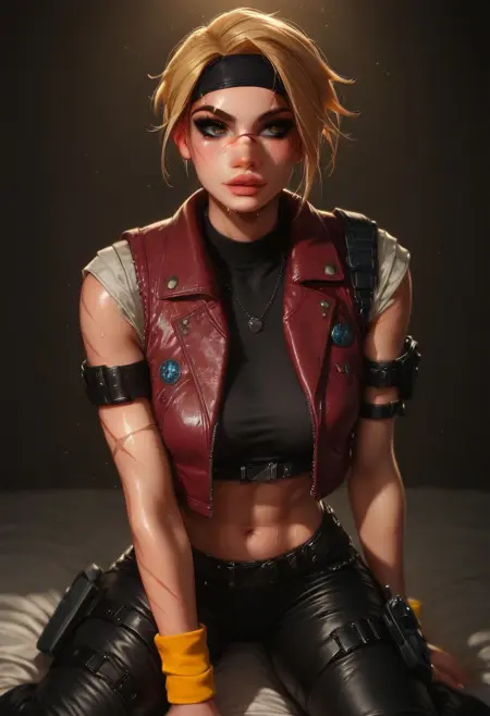 1girl, short hair, blonde hair, headband, black crop top, red vest, black pants, belts, holster, armband, yellow wristband, brown eyes, (scars on left side of body)