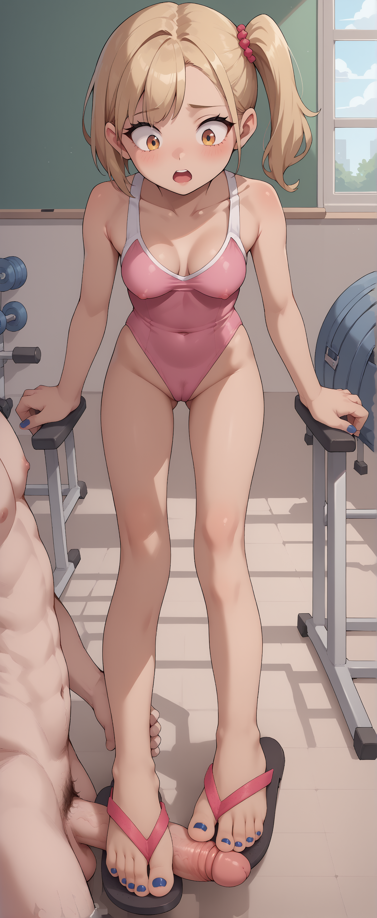 Specifically trained for flip flops. Ideally the penis is completely within the thong straps.