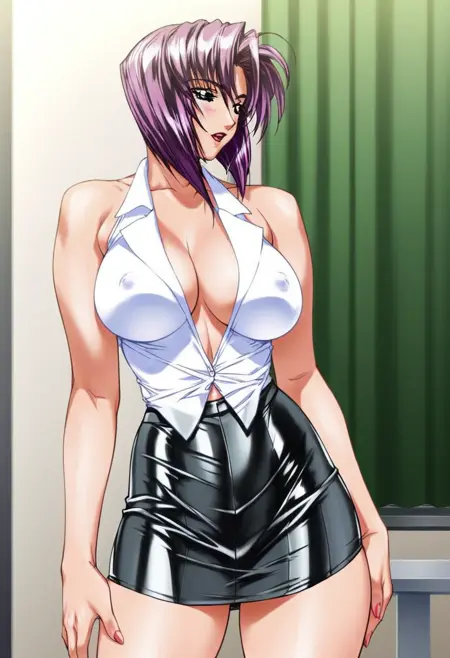 트리거: 오야마, 보라색 머리카락을 가진 여자, 단발, 큰 가슴, 셔츠, 젖꼭지 가림, 치마, 브라 없음