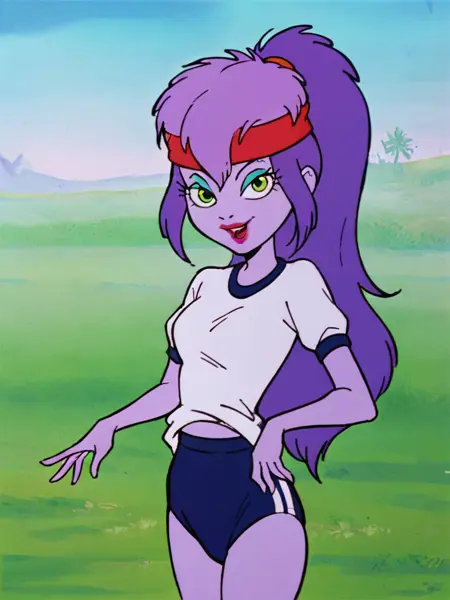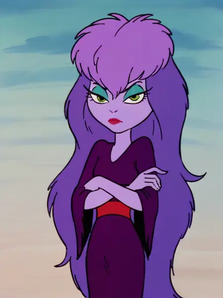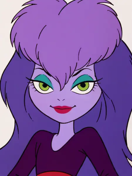 sibella dracula, purple skin, long hair, purple hair, green eyes, red lips, eyeshadow,