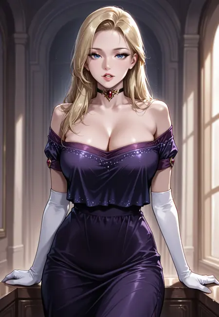- 목걸이, 보석, 보라색 드레스, 흰색 팔꿈치 장갑,