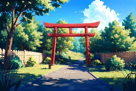 户外,天空,白天,云,树,蓝天,无人物,草地,地面车辆,风景,鸟居,超精细,8K,杰作,(无文字),无名称,(体积光)