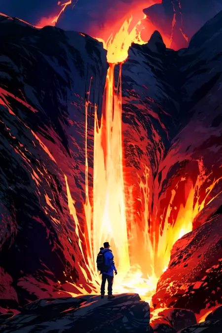 单人,1个男孩,站立,男性聚焦,(环境光),真实阴影,从背后,火焰,风景,岩石,洞穴,熔岩