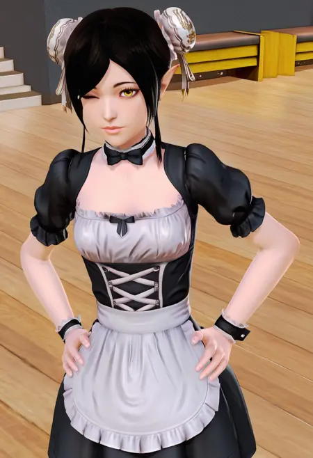Maid Lin: twin buns, bun covers, maid, waist apron, short sleeves, puffy sleeves, choker, white thighhighs, normalLin