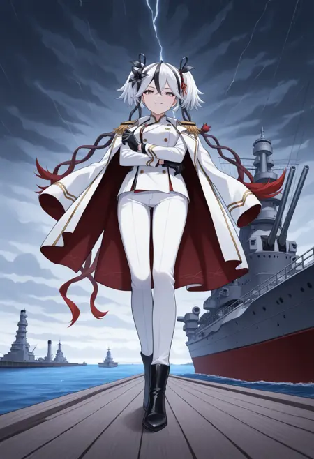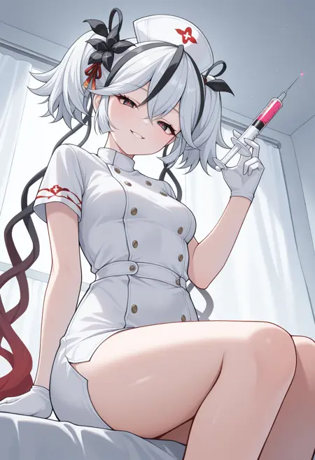 CamellyaDefault, black eyes, red pupils, white hair, black streaked hair, short twintails, hair ribbon, black ribbon, long ribbon, gradient ribbon, hair flower, black flower, gold earrings, detached collar, white collar, white shrug\(clothing\), short sleeves, collarbone, red flower on chest, white dress, sideless dress, navel cutout, ballet dress, single arm guard, white shorts, uneven legwear, single leg pantyhose, white pantyhose, white leg garter, toeless footwear, white footwear