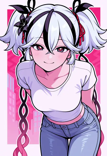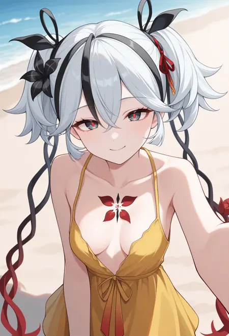 CamellyaWuWa, black eyes, red pupils, white hair, black streaked hair, short twintails, hair ribbon, black ribbon, long ribbon, gradient ribbon, hair flower, black flower, red flower on chest