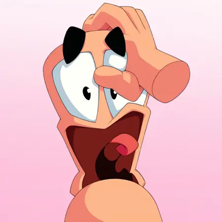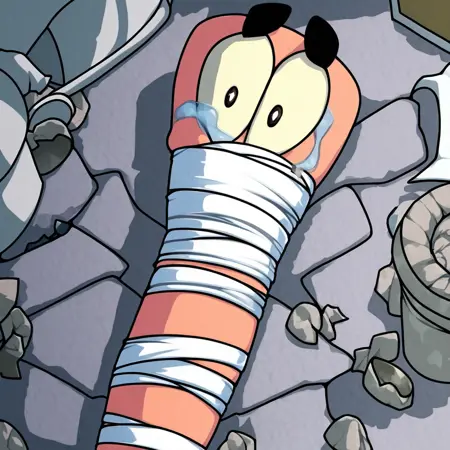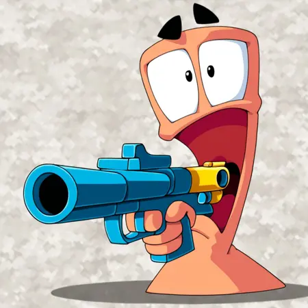 worms4mayhemca:_Worms: 4 Mayhem_のコンセプトアートと確信できるものに付与。線画はやや伝統的・粗く、温かみのあるトーン(元々強烈に色調がつけられていたため、修正しました)。つながった目を含んでいる可能性があります。