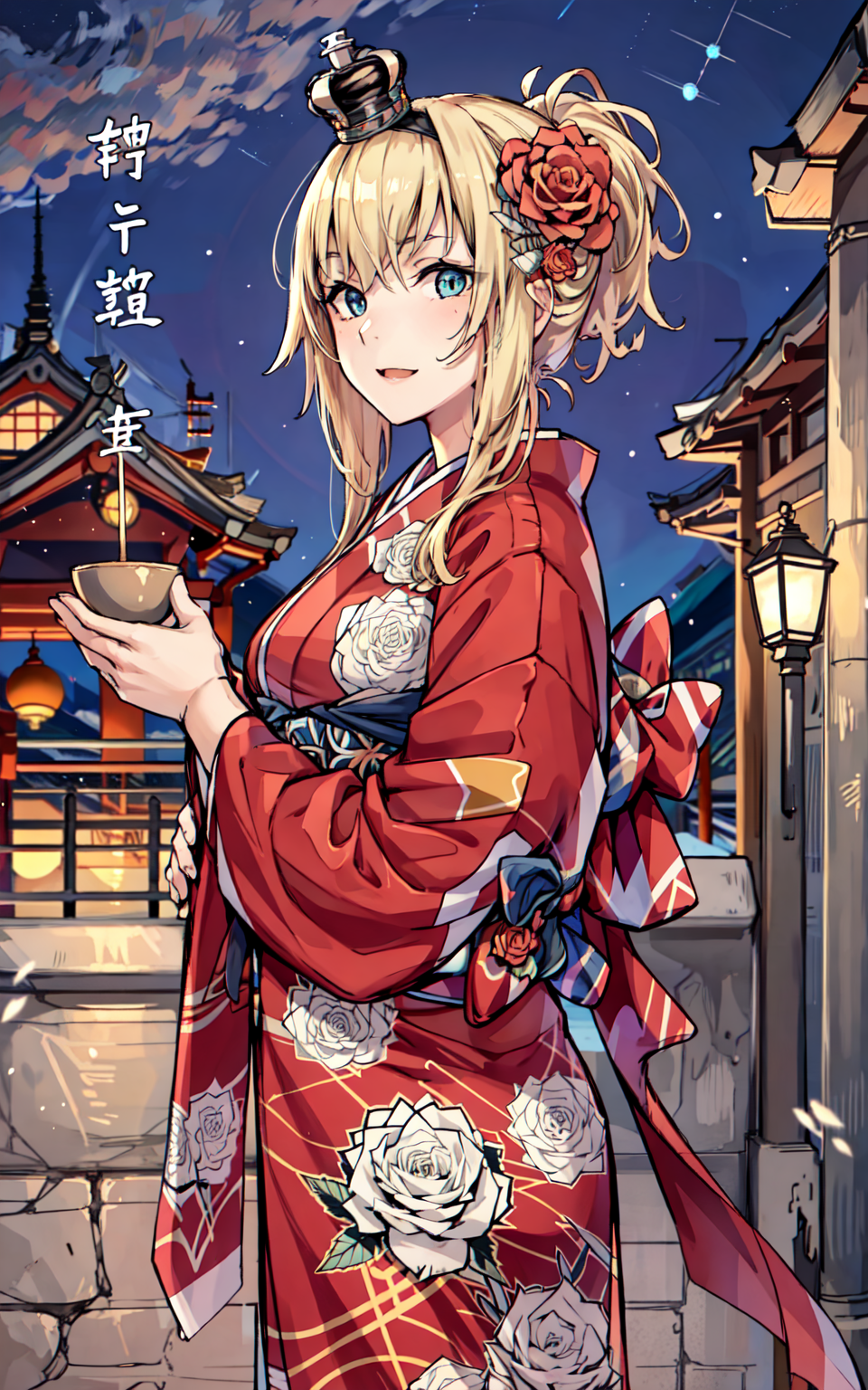 金发, 头花, 短发, 小皇冠, 长和服, 红色和服, 花纹图案, 振袖,