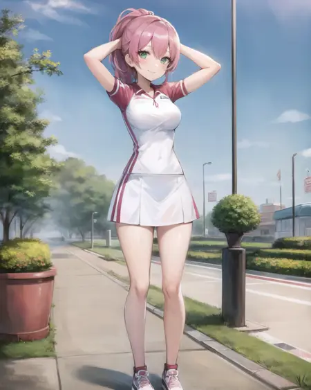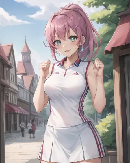 <lora:JunaTennis:0.8>, Juna Crawford, pink_hair, ponytail, hair_ornament, green_eyes, medium breasts,