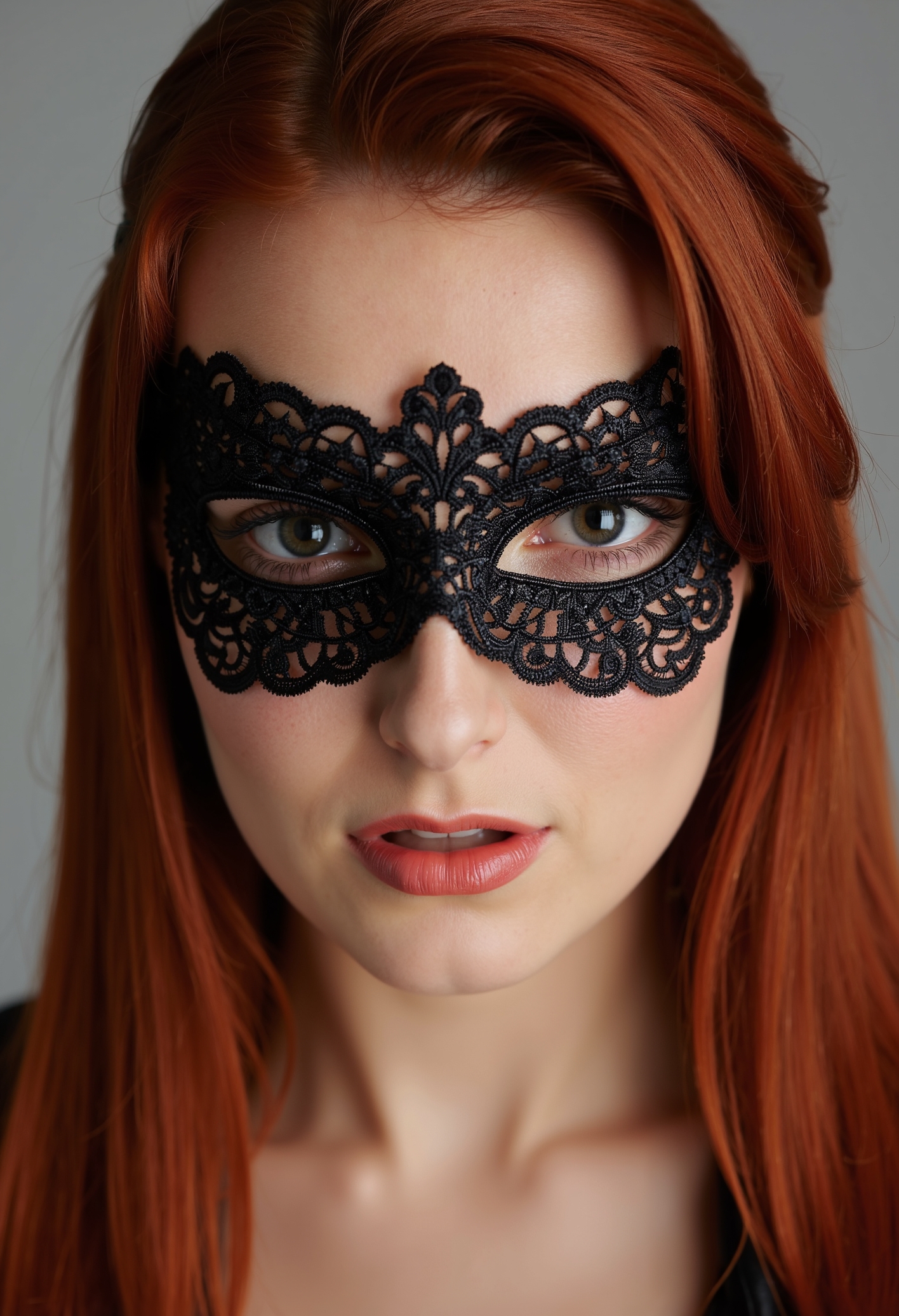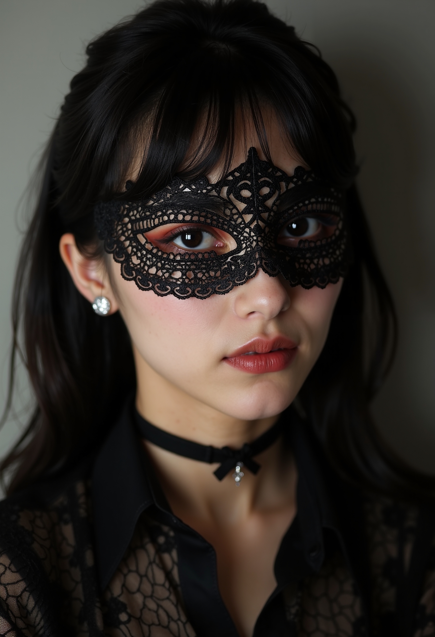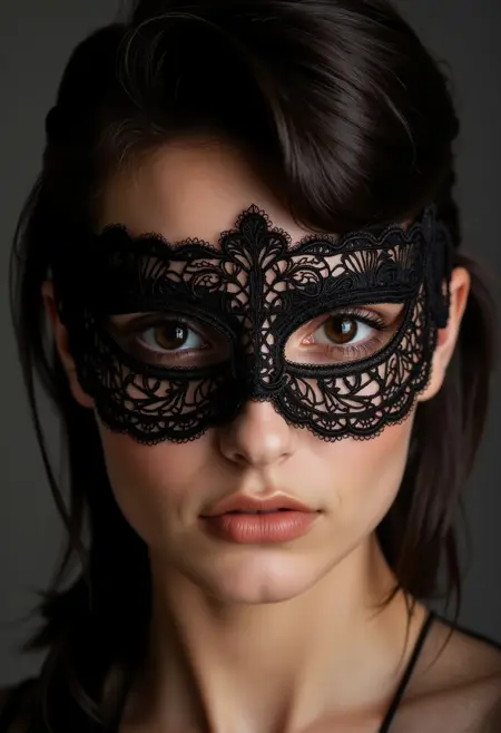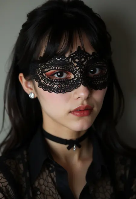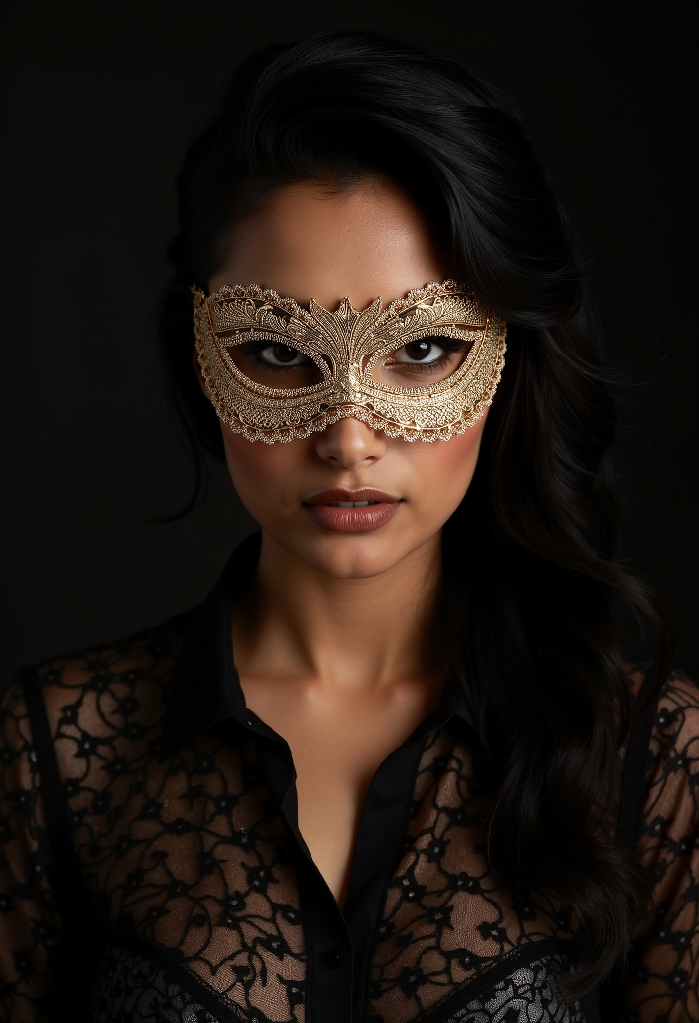 clo012, 정교하고 대칭적인 무늬가 있는 금색 레이스 안대 착용