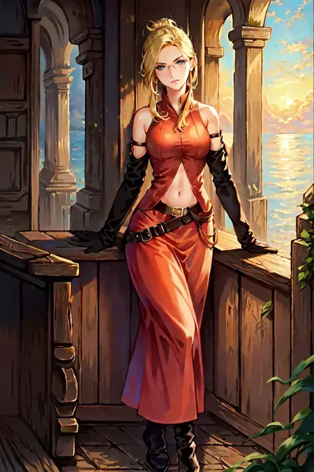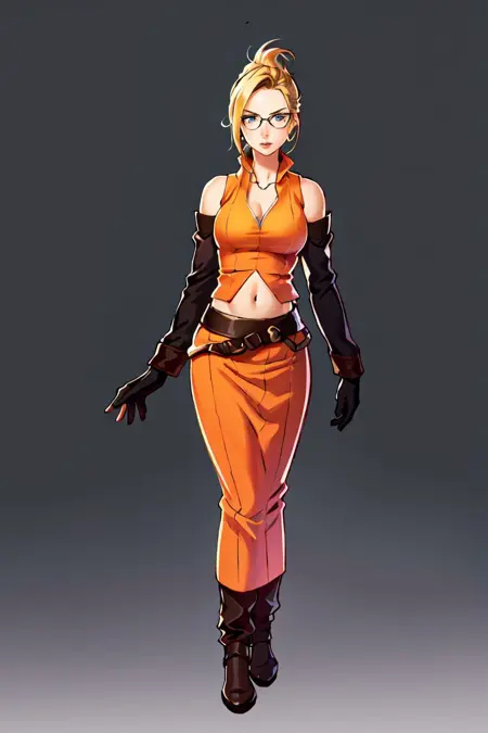 Example Prompt: UCA_Quistis, blonde hair, long hair, blue eyes, glasses, pink top, long skirt, gloves, midriff, navel, detached sleeves, belts