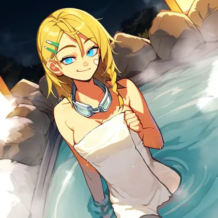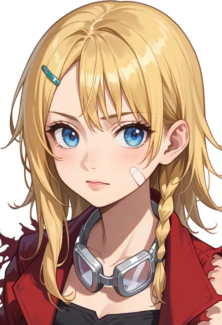 タグ: Rena_MM、金髪、青い目、ロングヘア、非対称ヘア、ヘアクリップ、片側編み込み、片側のツインテール、顔に絆創膏、首にゴーグル、