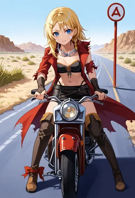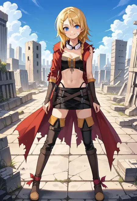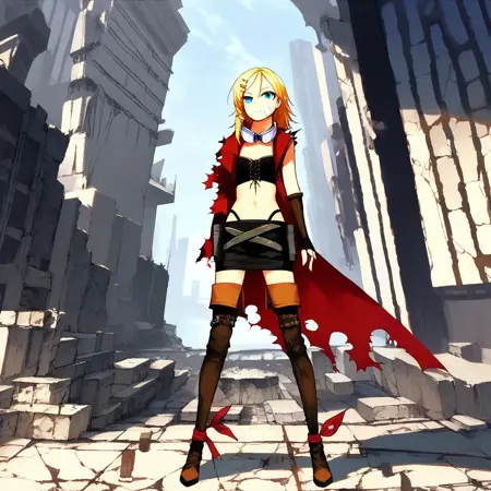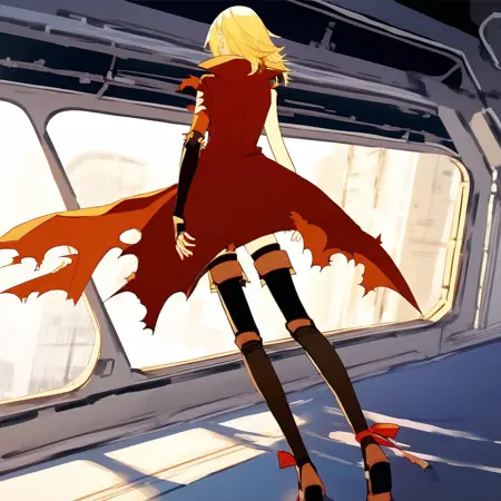 衣装: 赤いコート、衿付きコート、破れた袖、片袖、非対称袖、バストイア、前面結びトップ、お腹、へそ、ハイレグパンティー、クロスベルト、ホルスター、ミニスカート、黒いスカート、肘手袋、指なし手袋、破れたコート、太もも、黒い靴下、太ももポーチ、膝上ブーツ、くるぶしリボン、赤いリボン、非対称レッグウェア、茶色の履物、ブーツの下の太もも丈