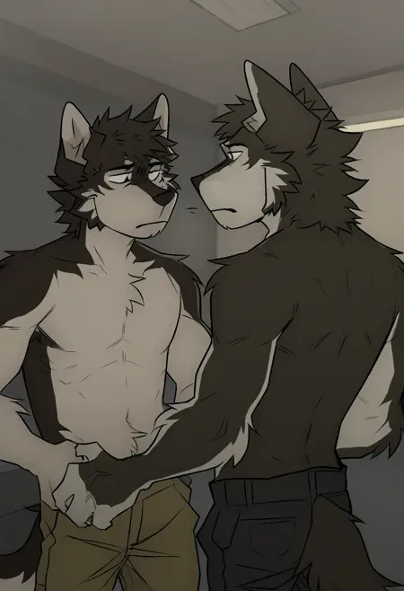 Pony: score_9, score_8_up, score_7_up, hi res, high quality, by maggotnizer, furry, solo, shirt, pants, short hair, 1boy/2boys, solo/duo, multiple boys, looking at viewer, ...your tags...
