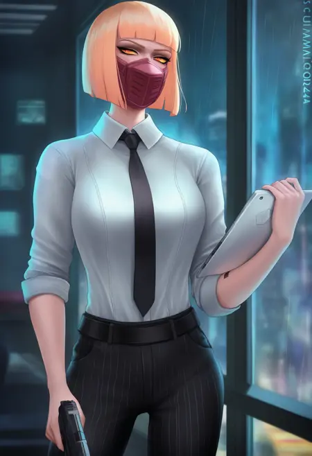 트리거 + 외모: k1w1, 사이보그, 단발, 금발, 곧은 앞머리, 밥컷, 입 마스크, 붉은 눈, 노랑색 공막