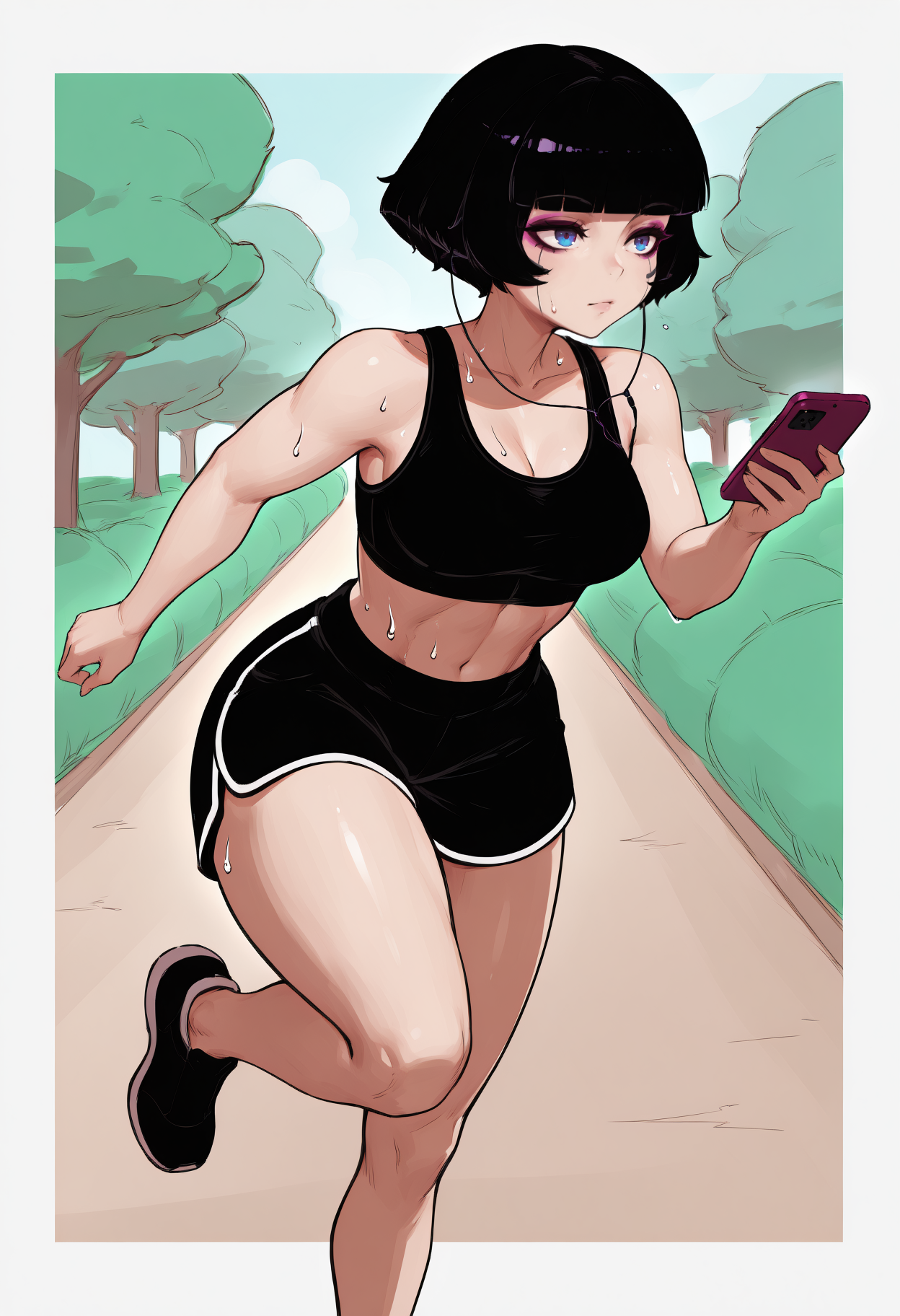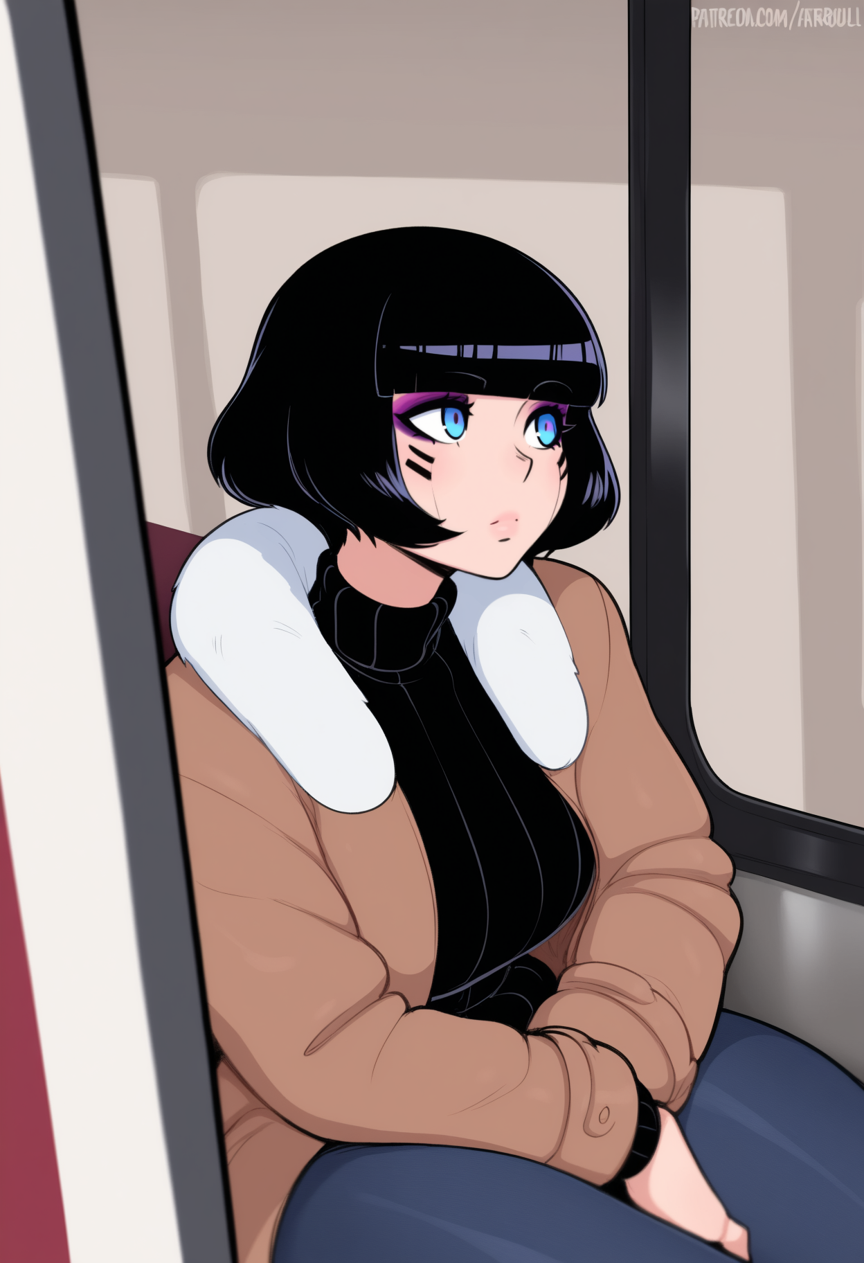 트리거 + 외모: sasha yakovleva, 메이크업, 단발머리, 검은 머리, 곧은 앞머리, 밥컷, 파란 눈