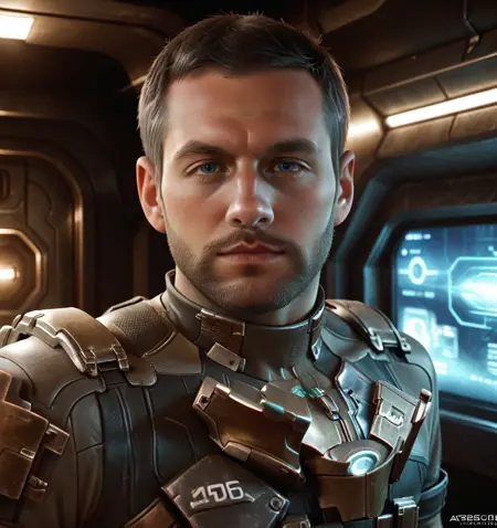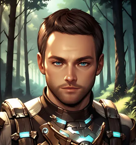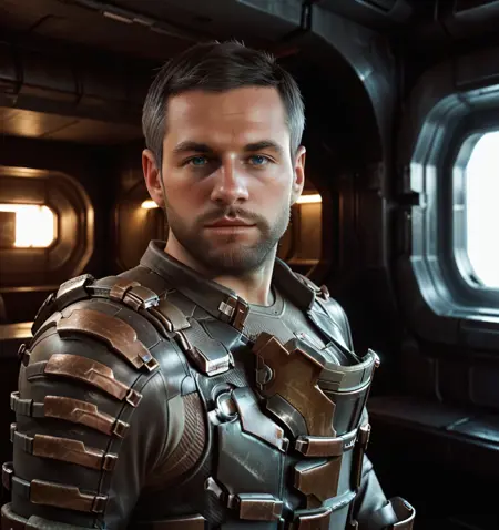 isaac、茶色の短い髪、疲れた表情、青い目、顔の髭、ひげ、鎧を着用、丸い顔、ブーツ、手袋、SF