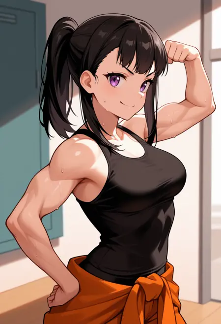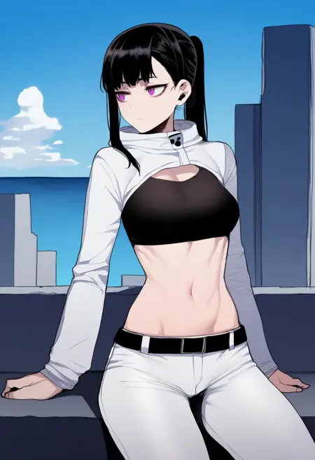 트리거 + 외모: m4ki 0ze, 근육질의 여성, 긴 머리, 검은 머리, 포니테일, 보라색 눈
