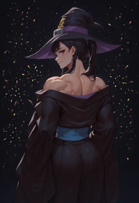 복장 #2: 마녀 모자, 갑옷, 검은 비키니, 비키니 상의만, 샬, 분리된 소매, 검은 장갑, 긴 치마, 검은 치마, 어깨 노출