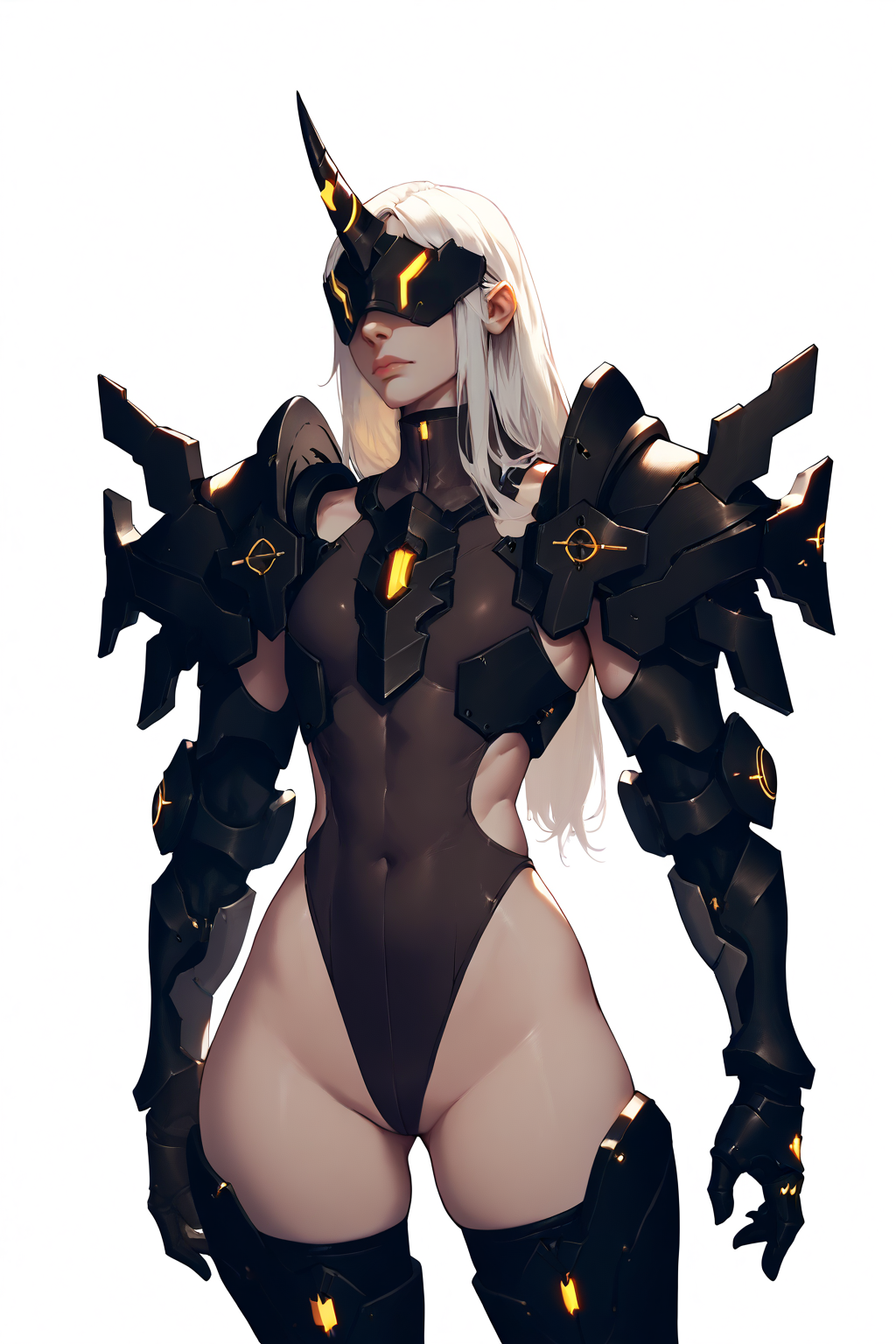 absgayle, visor, covered eyes, single horn, shoulder armor, black leotard, thigh boots