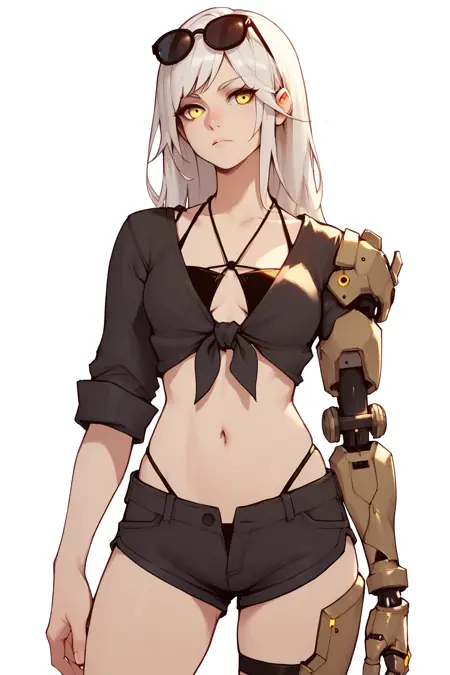 summergayle, eyewear on head, front-tied top, black bikini, short shorts