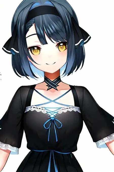 짧은 머리, 앞머리, 검은 머리, 드레스, 파란 머리, 머리끈, 가상 유튜버, 검은 드레스, 초크, 검은 초크, 머리 끝, 검은 머리끈, StelLive1, Gang.G
