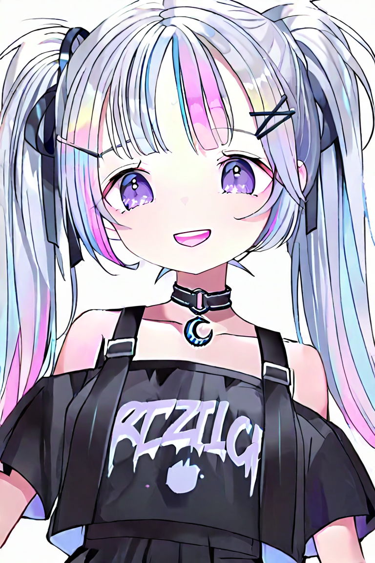 긴 머리, 앞머리, 셔츠, 머리 장식, 리본, 어깨 노출, 더블 테일, 파란 머리, 머리 리본, 분홍 머리, :d, 다색 머리, 이빨, 머리 클립, 스트라이프 머리, 검은 셔츠, 검은 리본, 위쪽 이빨, x 머리 장식, 보라색 머리, 초크, 초상화, 스파이크, StelLive1, AyatsunoYuni
