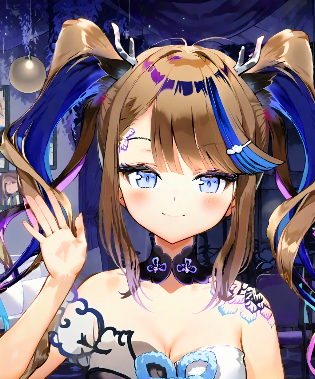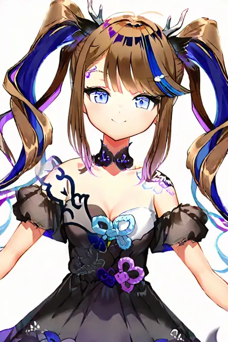 긴 머리, 앞머리, 갈색 머리, 머리 장식, 더블 테일, 파란 머리, 다색 머리, 이톤 머리, 스트라이프 머리, 뿔, 드레스, 가슴 노출, 어깨뼈, 가상 유튜버, StelLive1, AiriKanna