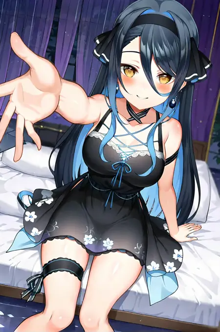 앞머리, 검은 머리, 리본, 눈 사이 머리, 매우 긴 머리, 파란 머리, 머리끈, 다색 머리, 가상 유튜버, 검은 드레스, 검은 머리끈, 색상 내부 머리, 머리 리본, 이톤 머리, 검은 리본, 그라데이션 머리, StelLive1, Gang.G
