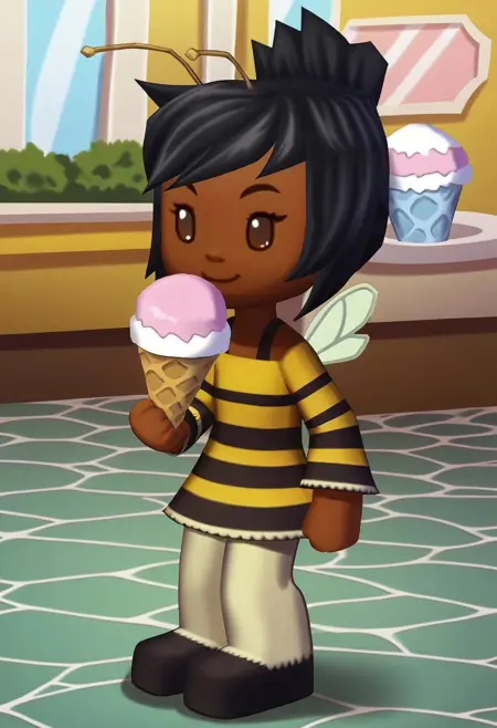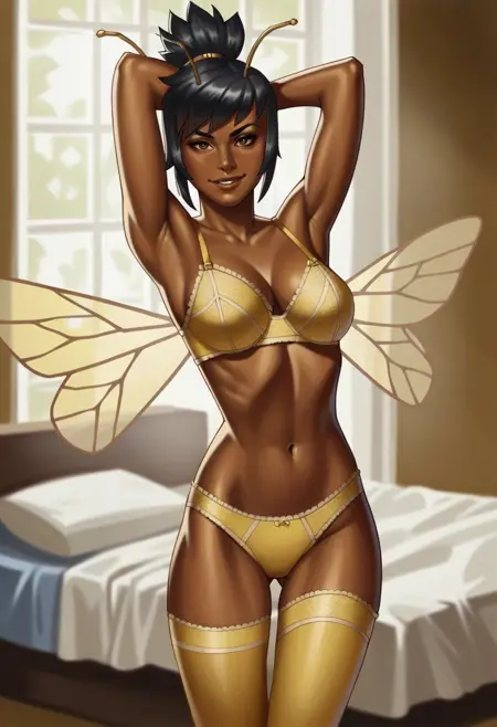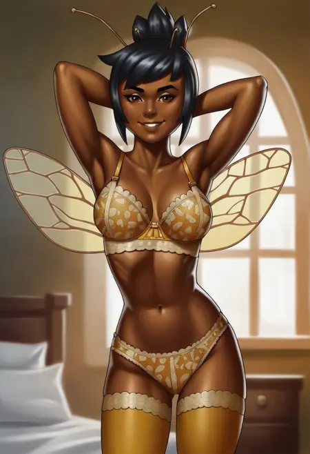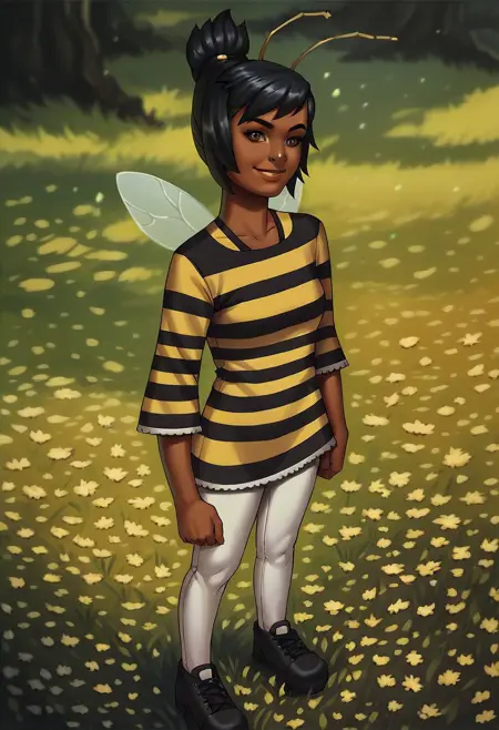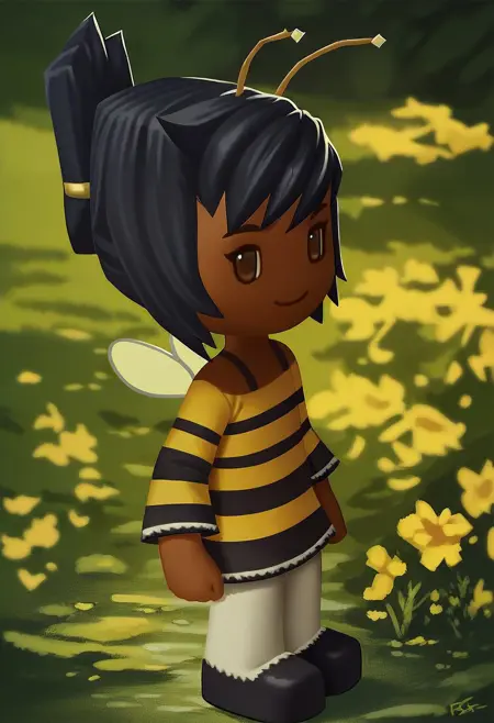 タグ: "Roxie_R_MySims, 暗い肌の女性, 触角, 縞模様のシャツ, レギンス, 靴, 黒髪, 茶色の目, 昆虫の羽"。私のすべてのMySimsモデルと同様に、ゲーム内フォームが欲しい場合は「Chibi」を追加してください。また、ポジティブプロンプトに「adult」、ネガティブプロンプトに「child」を追加すると、より自然な外観になります。