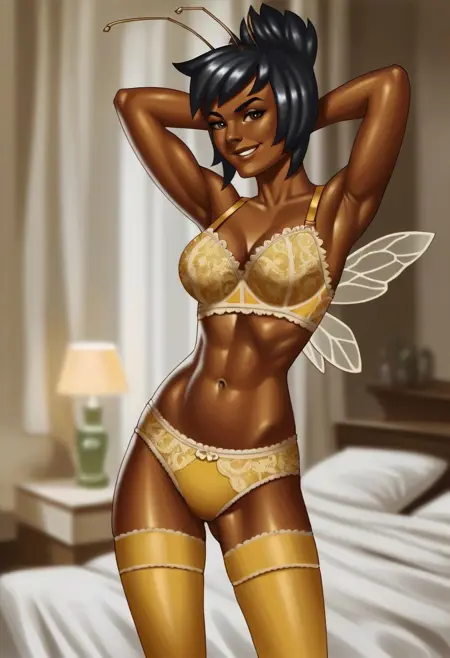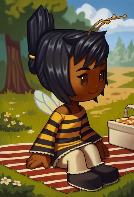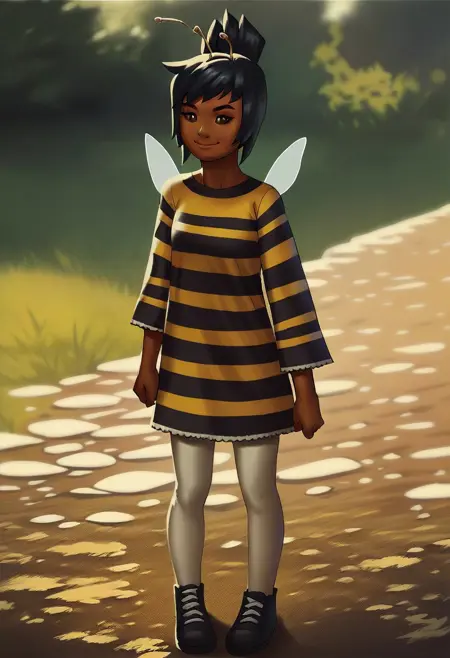 Tags are: "Roxie_R_MySims, dark-skinned female, antennae, striped shirt, leggings, shoes, black hair, brown eyes, insect wings". As with all my MySims models, add "Chibi" if you want her in-game form, and adding "adult" to the positive prompt and "child" to the negative may help things to look right.