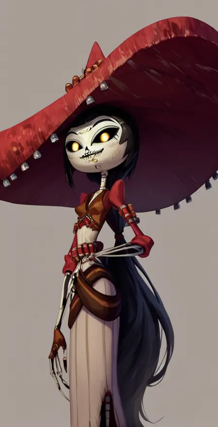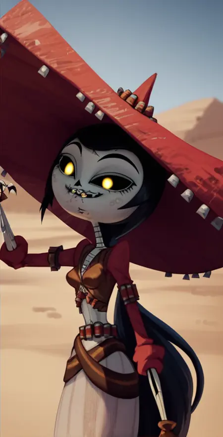アデリータ・サンチェスを生成できます。プロンプトに「アイパッチ」を含めると、彼女の妹をアイパッチ付きで生成することも可能ですが、その品質は安定して高くはありません。また、プロンプトから「deadsanchez」「黄色い目」「色付きの巩膜」「黒い巩膜」の語を除外すれば、人間版を生成することも可能です。ただし、アデリータ・サンチェスの生きたバージョン向けに推奨したタグを変更すると、なぜかプロポーションが正しくならなくなります。
