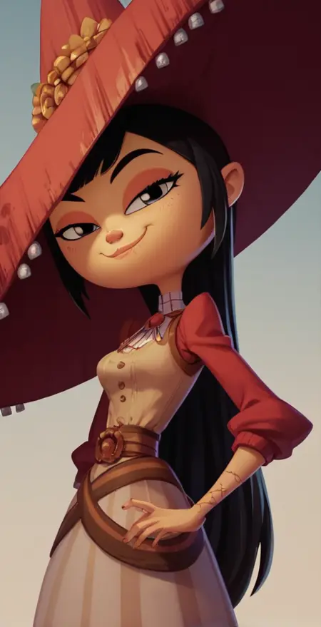 生きているアデリータ・サンチェス:score_9, score_8_up, score_7_up, score_6_up, solo, 1girl, hat, black hair, black hair, smug