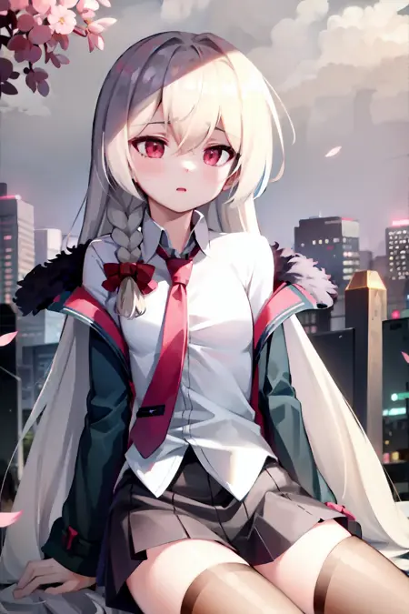 prompt: orcarearm, 1girl, white shirt, black skirt, hair bow, fur-trimmed jacket, red necktie, single braid