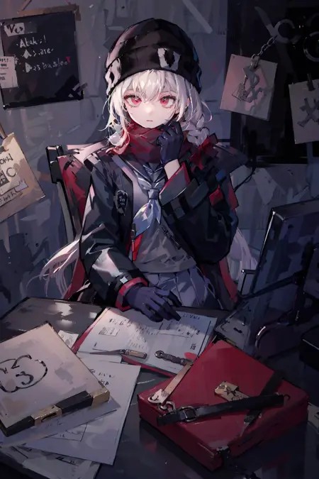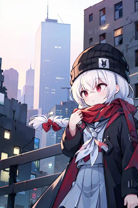 prompt: orcareg, 1girl, hair bow, beanie, black serafuku, black jacket, neckerchief, red scarf, black glove, single braid