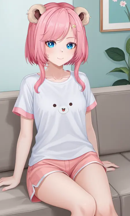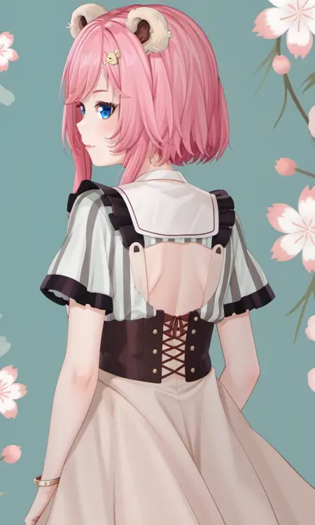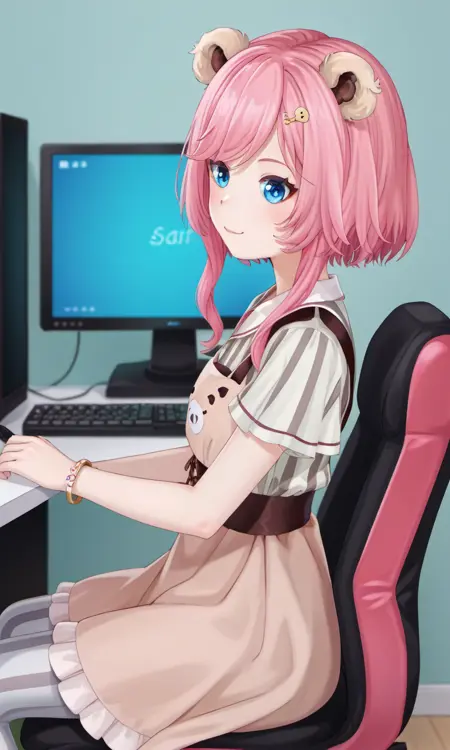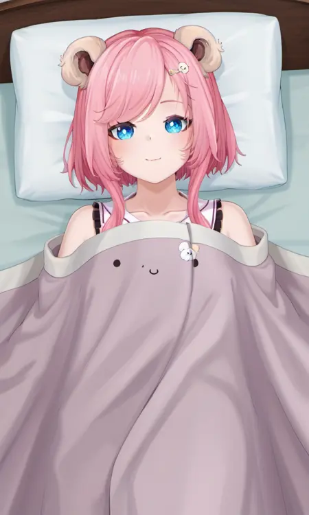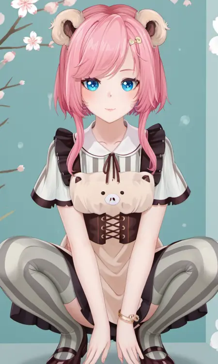 satiakura, 1girl, virtual youtuber, blue eyes, pink hair, short hair, hair ornament, bear ears,