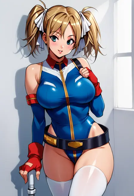 Trigger: reiko_g, twintails, blonde hair, large breasts, highleg leotard, blue leotard, fingerless gloves, white thighhighs,