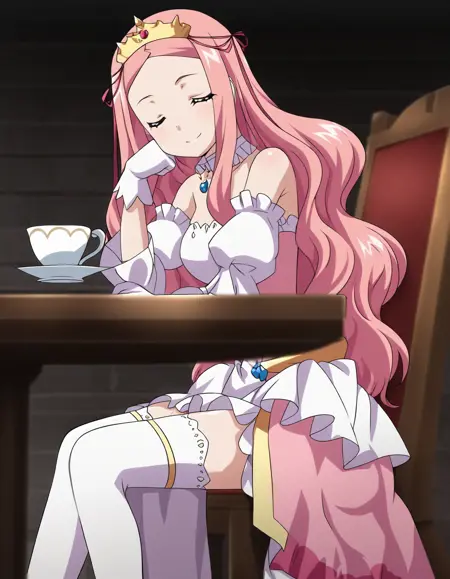 pr1mk5ro, (파란 눈동자:0.4), 왕관, 분리된 소매, 흰색 장갑, 흰색 허벅지 양말, 분홍색 팬티, 열린 드레스