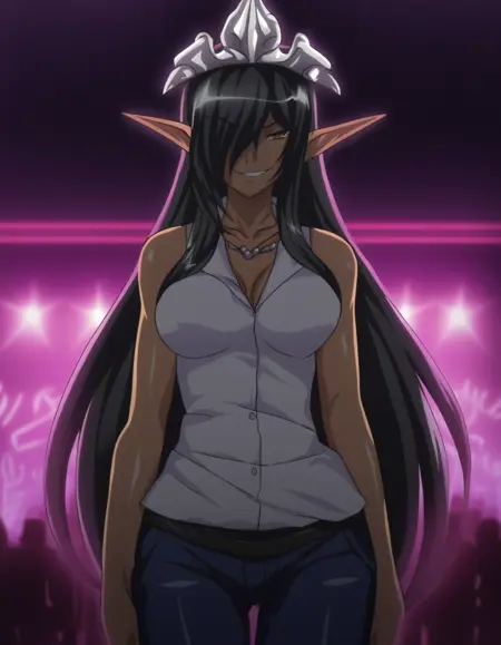 0rog4, (노란 눈동자:0.4), (검은 머리:0.8), (한쪽 눈 위의 머리카락:0.7), 검은 피부를 가진 여자, 왕관, (은색 왕관:0.3), 귀걸이, 가슴 부분 노출, (어깨 노출:0.6), (중앙 개방:0.6), (분리된 소매:0.5), 하이레그 팬티, 검은 팬티, 보라색 허벅지 양말