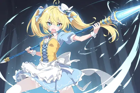 Baimei,waist apron,blue dress,yellow twintails,mini top hat